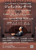 | アンサンブル・カンタービレ&名古屋混声合唱団ジョイントコンサート 2025年11月30日 (愛知県芸術劇場 コンサートホール) ![]() Ⅰ.アンサンブル・カンタービレ 信長貴富作品集 1.しあわせよカタツムリにのって 作詩 やなせたかし 2.きみ歌えよ 作詩 谷川俊太郎 3.夕焼け 作詩 高田 敏子 4.ボクはウタ 作詞 江村 美紀 指 揮:野々山 敬之 ピアノ:伊與木 慶子 Ⅱ.名古屋混声合唱団 四季折々の歌 ~昭和合唱曲あれこれ~ 1.風が(心の四季より) 作詩 吉野 弘 作曲 髙田 三郎 2.早春(光る砂漠より) 作詩 矢澤 宰 作曲 萩原 英彦 3.投げよう林檎を(蔵王より) 作詩 尾崎左永子 作曲 佐藤 眞 4.秋の風(風のうたより) 作詩 中村千榮子 作曲 大中 恩 5.雪の日に(心の四季より) 作詩 吉野 弘 作曲 髙田 三郎 指 揮:大橋 多美子 ピアノ:中村 節 ~ 休憩 15分 ~ Ⅲ.合同演奏 REQUIEM op.48 作曲 Gabriel Urbain Fauré (ガブリエル・ユルバン・フォーレ) オルガン編曲 Thomas Meyer-Fiebig (トーマス・マイヤー=フィービッヒ) Ⅰ.Introït et Kyrie(入祭唱とキリエ) Ⅱ.Offertoire(奉献唱) Ⅲ.Sanctus(聖なるかな) Ⅳ.Pie Jesu(慈悲深きイエスよ) Ⅴ.Agnus Dei(神の子羊) Ⅵ.Libera me(私をお救い下さい) Ⅶ.In paradisum(楽園へ) 客演指揮:谷 郁 オルガン:吉田 文 ソプラノ:本田美香 バリトン:野々山 敬之 アンコール Abendlied(夕べのうた) 作曲 Josef Gabriel Rheinberger |